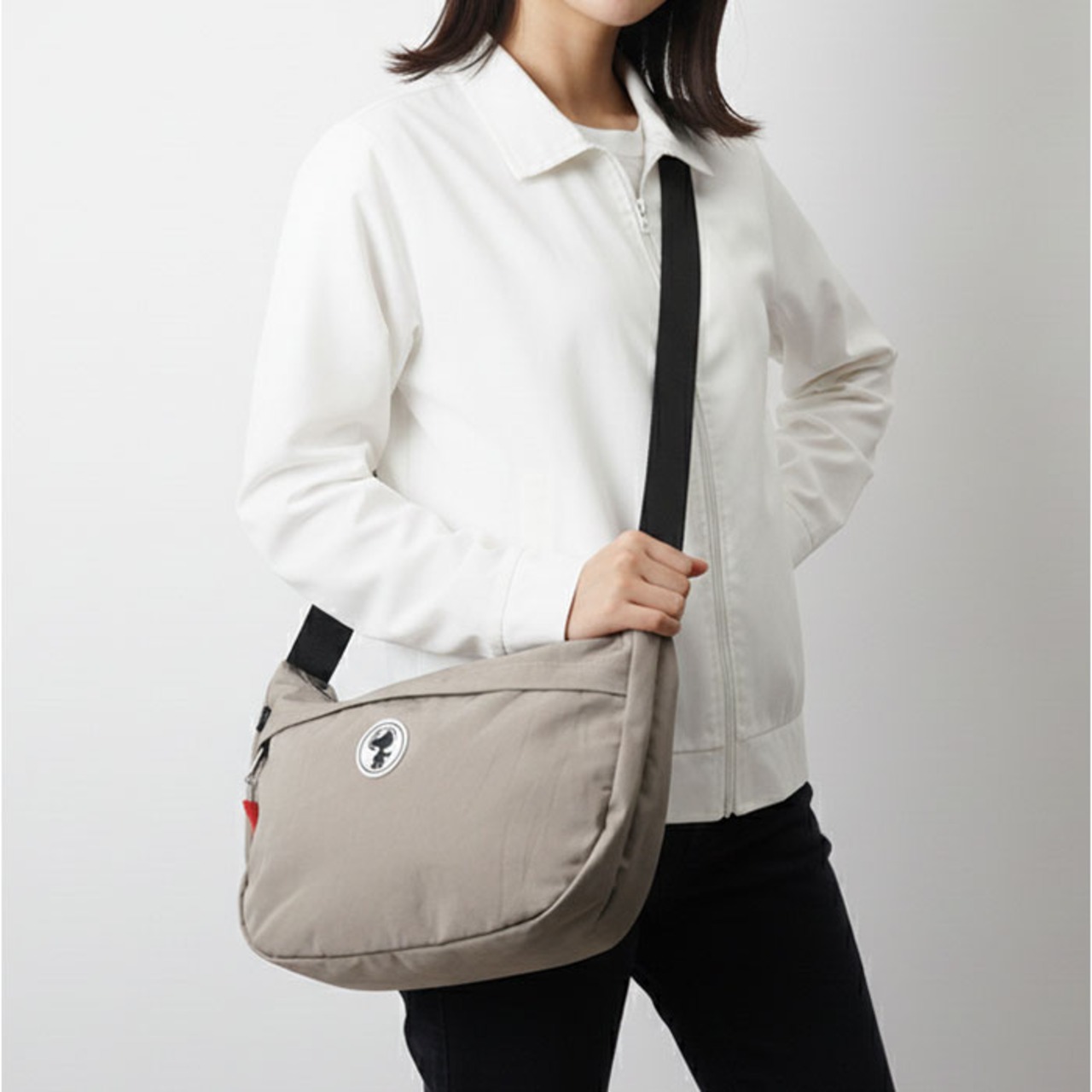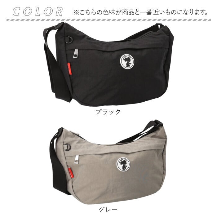 ・ころんと愛らしい半月型フォルム。スヌーピーのパッチや内生地の配色がアクセント。