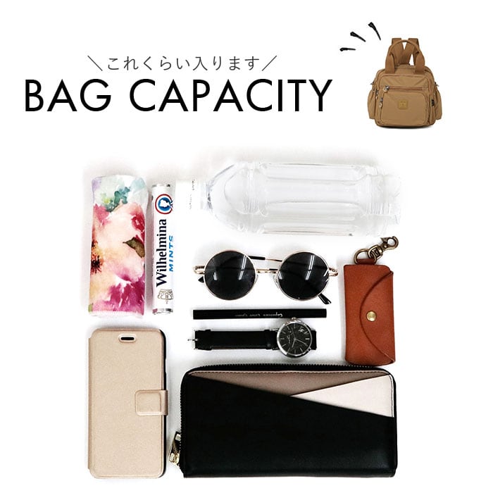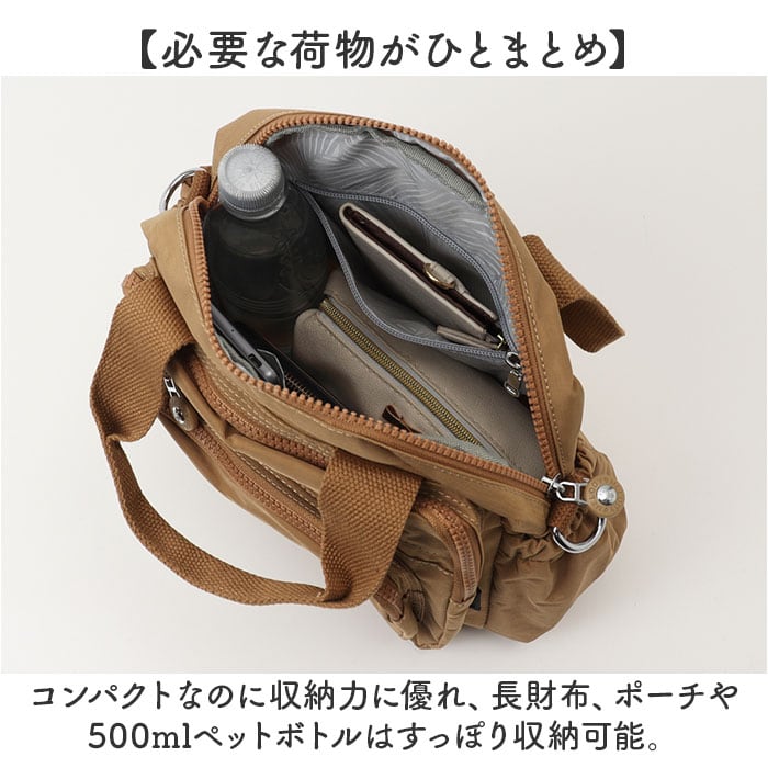 ・コンパクトなのに収納力に優れ、長財布、ポーチや500mlペットボトルはすっぽり収納可能。
