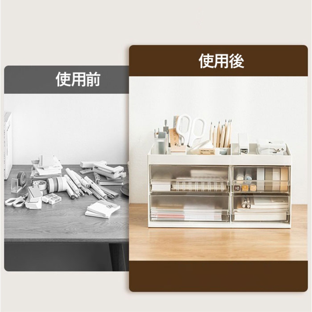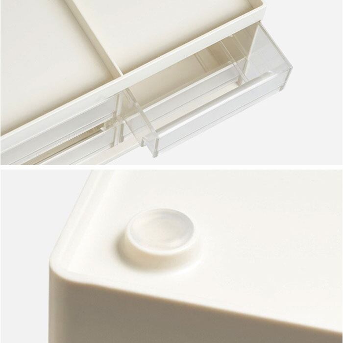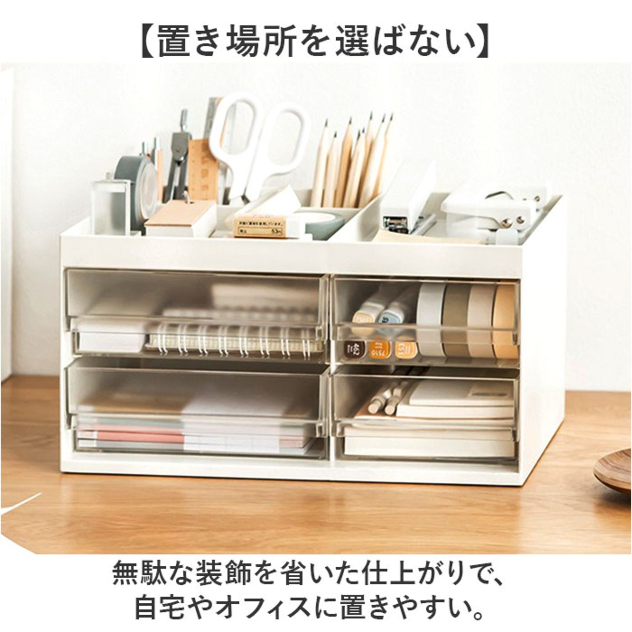 4つの仕切り、引き出しで文具・コスメなど分類がしやすい。