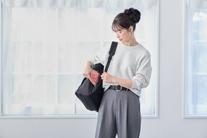 ・電車内で前に抱えた時に、内ポケットからの小物の出し入れが便利なつくり。上部は長さ調整可能なバッグルで留めてあるので、バックルを閉じたままでもモノの出し入れが可能です。