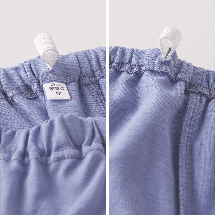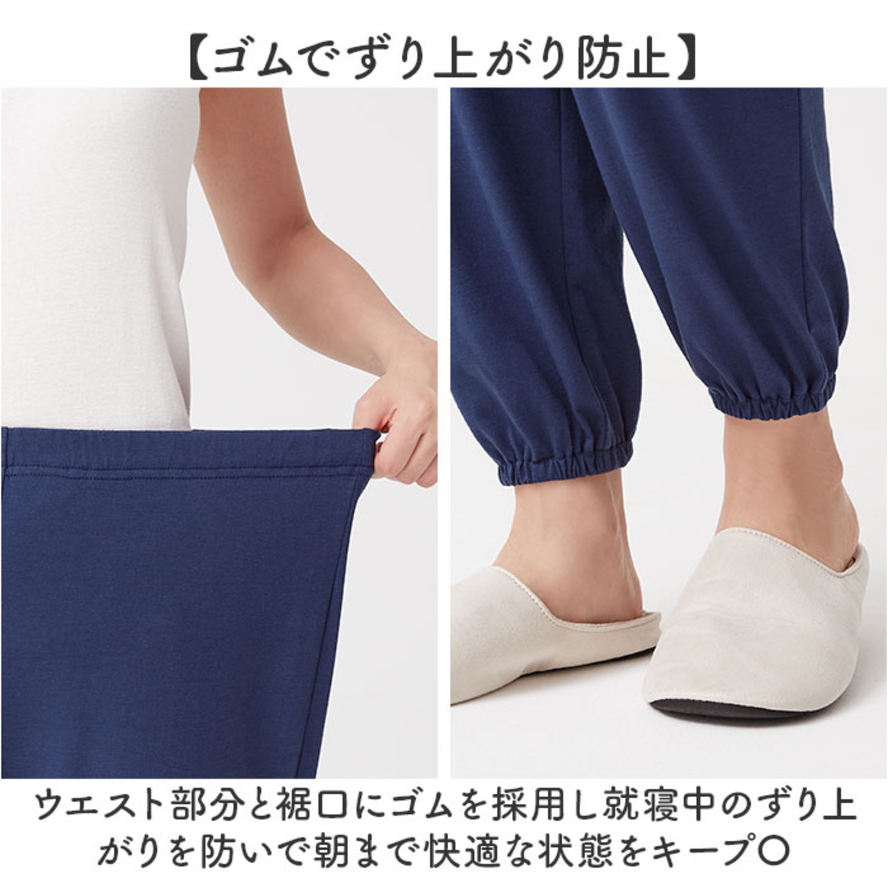 【ゴムでずり上がり防止】ウエスト部分と裾口にゴムを採用し就寝中のずり上がりを防いで朝まで快適な状態をキープ〇