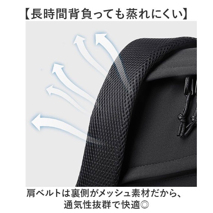 ・肩ベルトは裏側がメッシュ素材だから、通気性抜群で快適◎