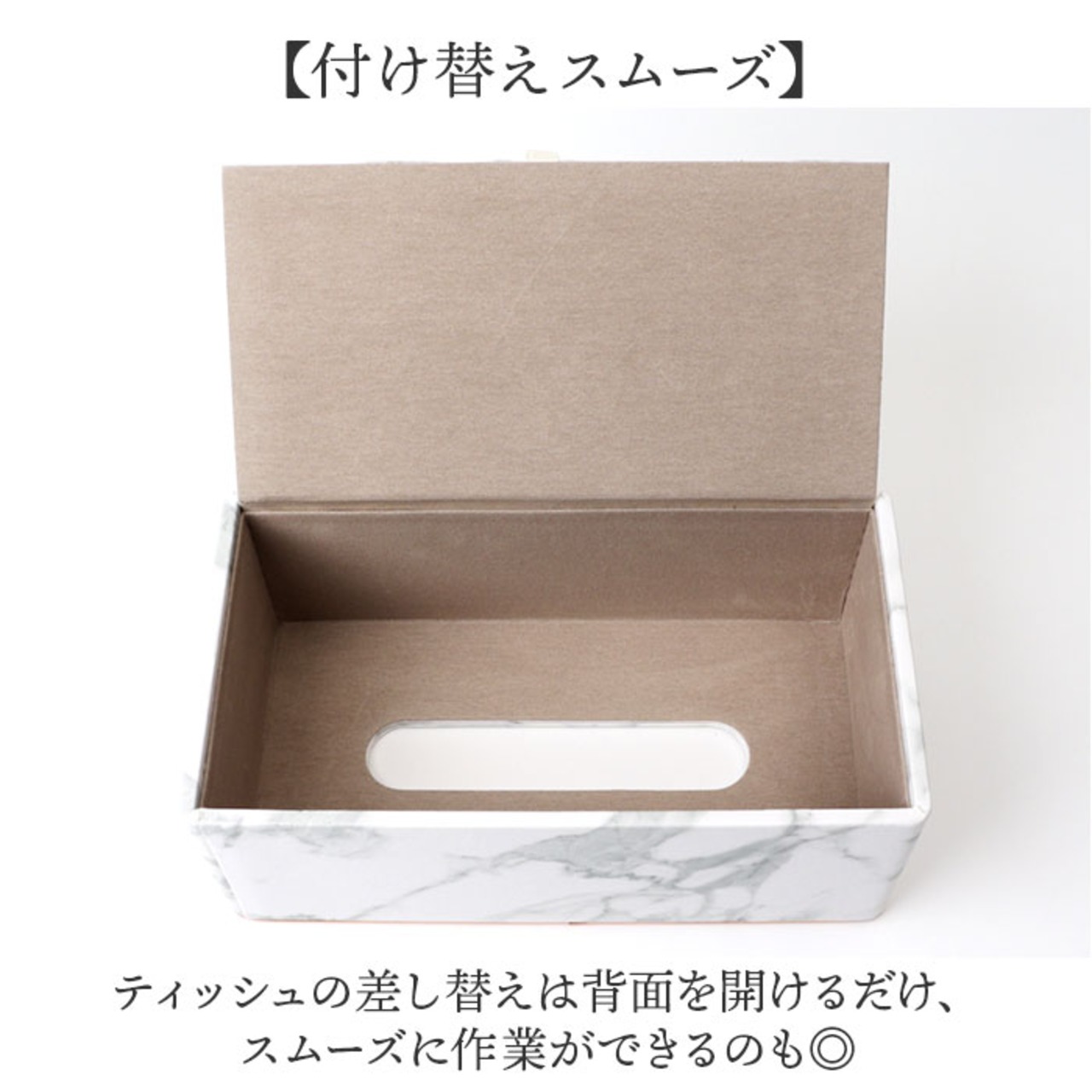 ・ティッシュの差し替えは背面を開けるだけ、スムーズに作業ができるのも◎