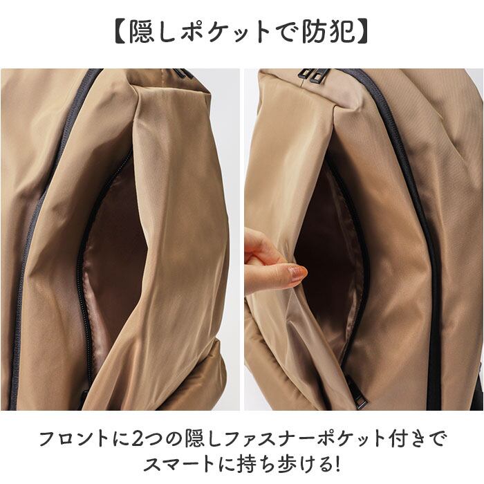 ・フロントに2つの隠しファスナーポケット付きでスマートに持ち歩ける!