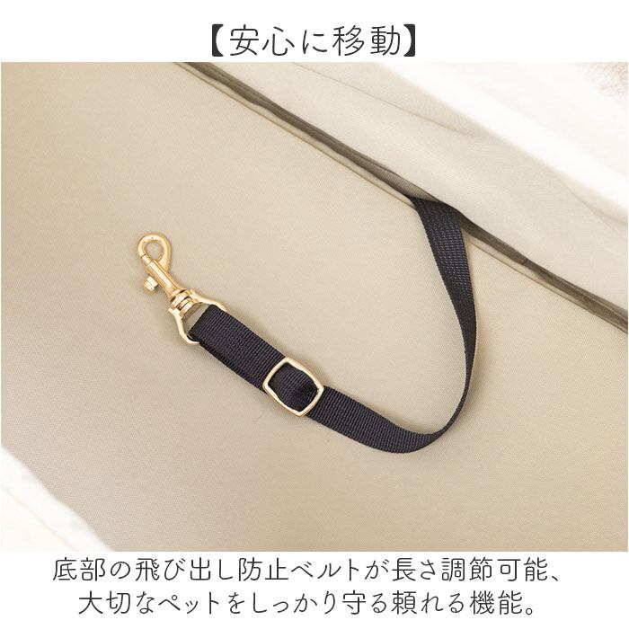 ・底部の飛び出し防止ベルトが長さ調節可能、大切なペットをしっかり守る頼れる機能。