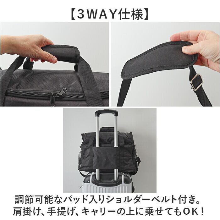 ・調節可能なパッド入りショルダーベルト付き。肩掛け、手提げ、キャリーの上に乗せてもOK!