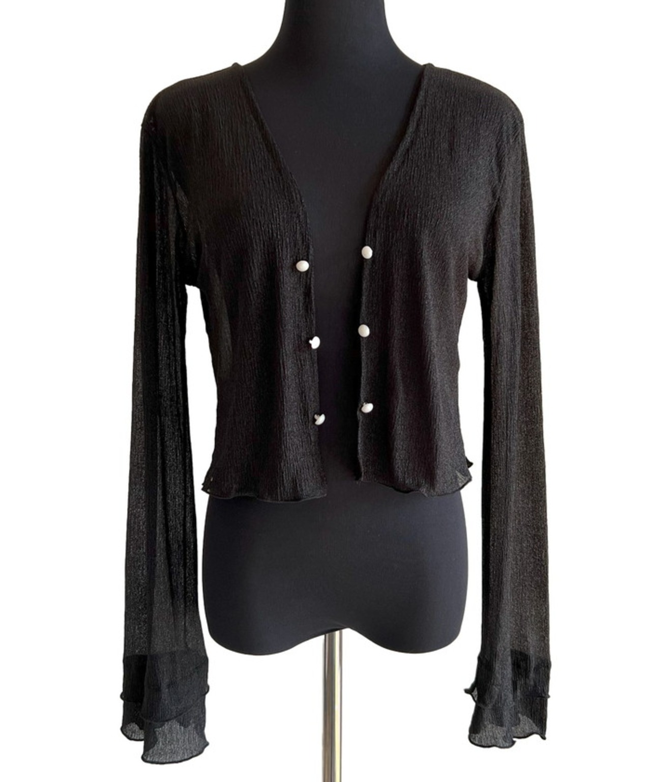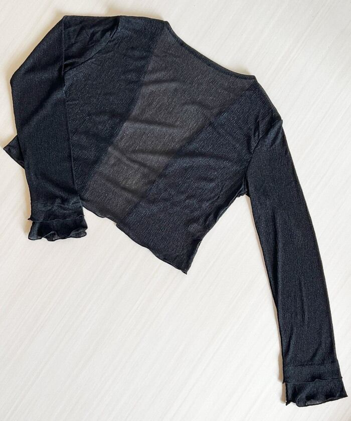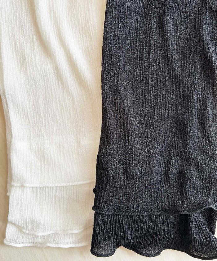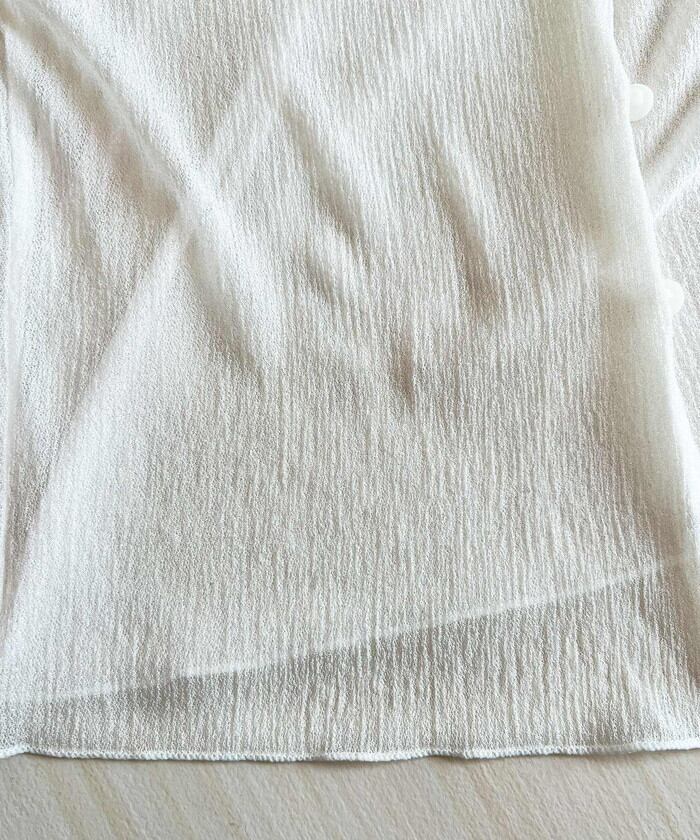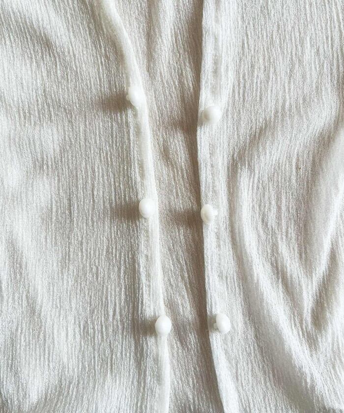 ・軽やかなシアー素材にフレアスリーブとさりげないパールボタンを添え、シンプルながらも洗練された印象に。