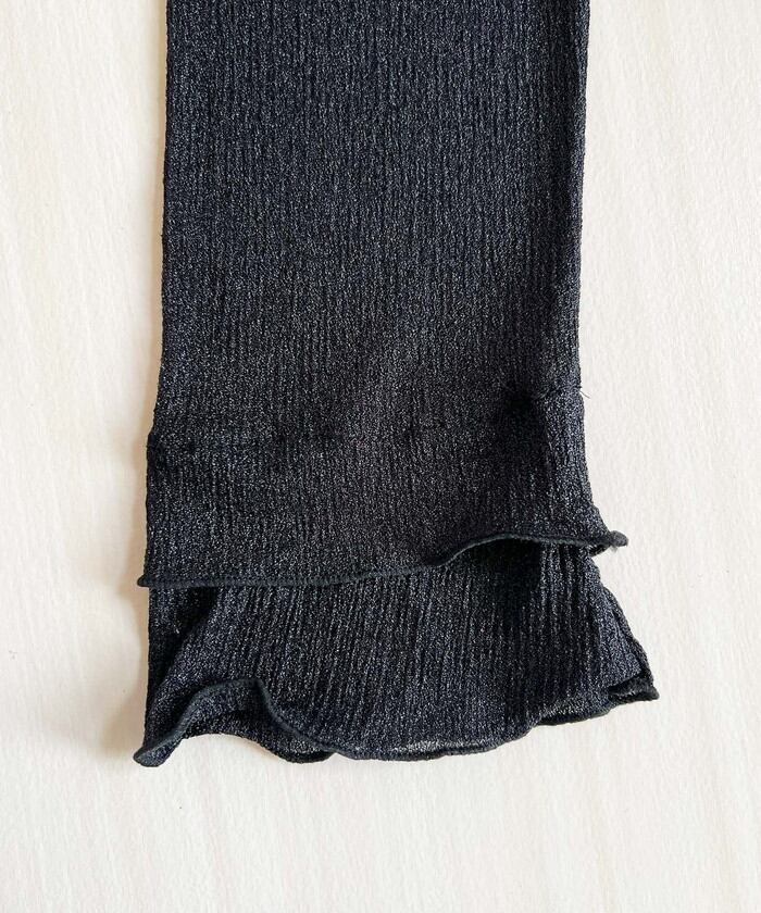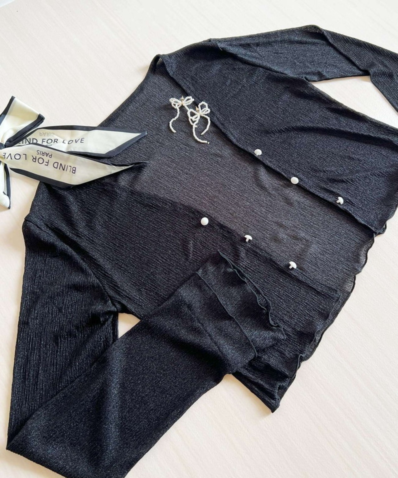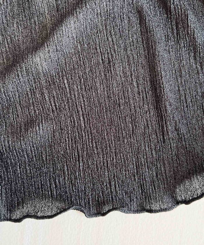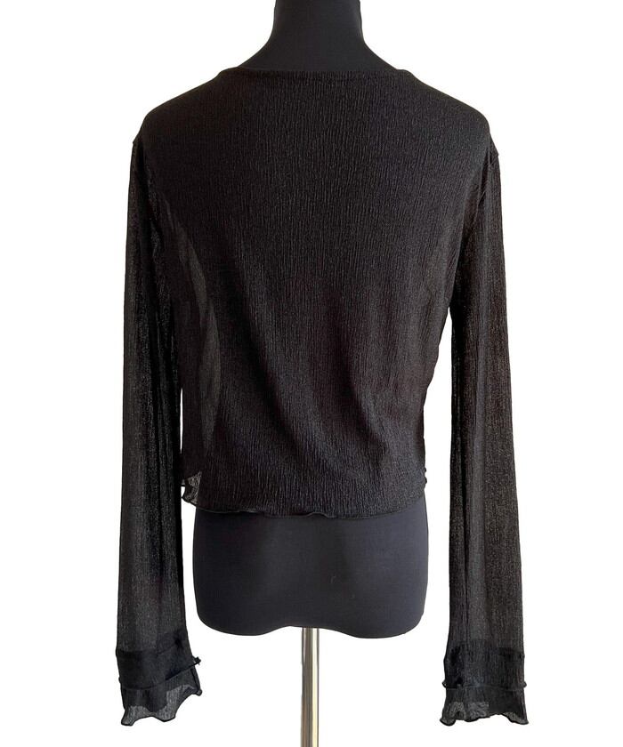 ・軽やかなシアー素材にフレアスリーブとさりげないパールボタンを添え、シンプルながらも洗練された印象に。