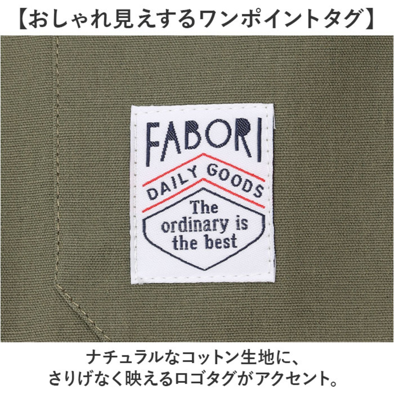 ・ナチュラルなコットン生地に、さりげなく映えるロゴタグがアクセント。