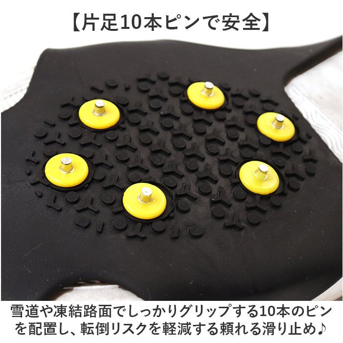 ・雪道や凍結路面でしっかりグリップする10本のピンを配置し、転倒リスクを軽減する頼れる滑り止め♪