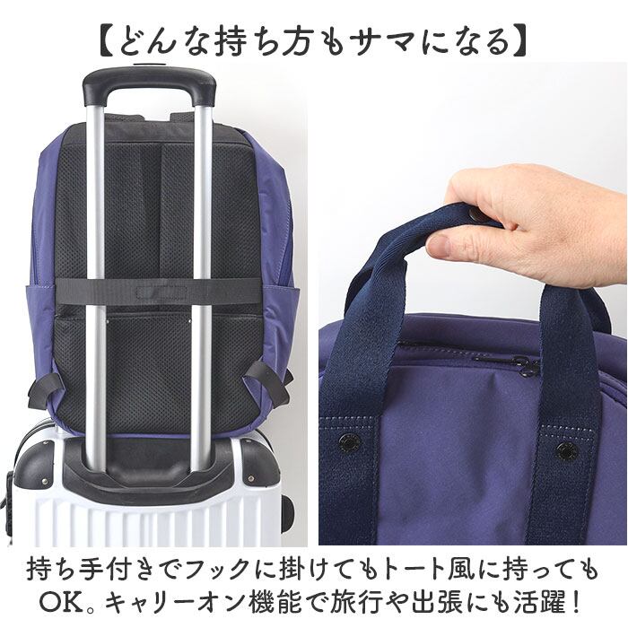 ・持ち手付きでフックに掛けてもトート風に持ってもOK。キャリーオン機能で旅行や出張にも活躍!