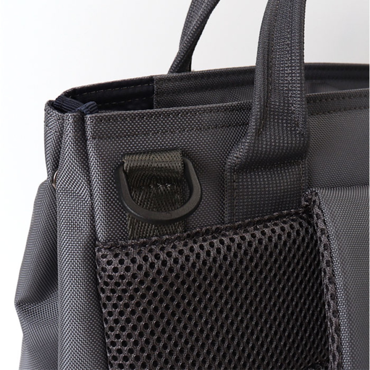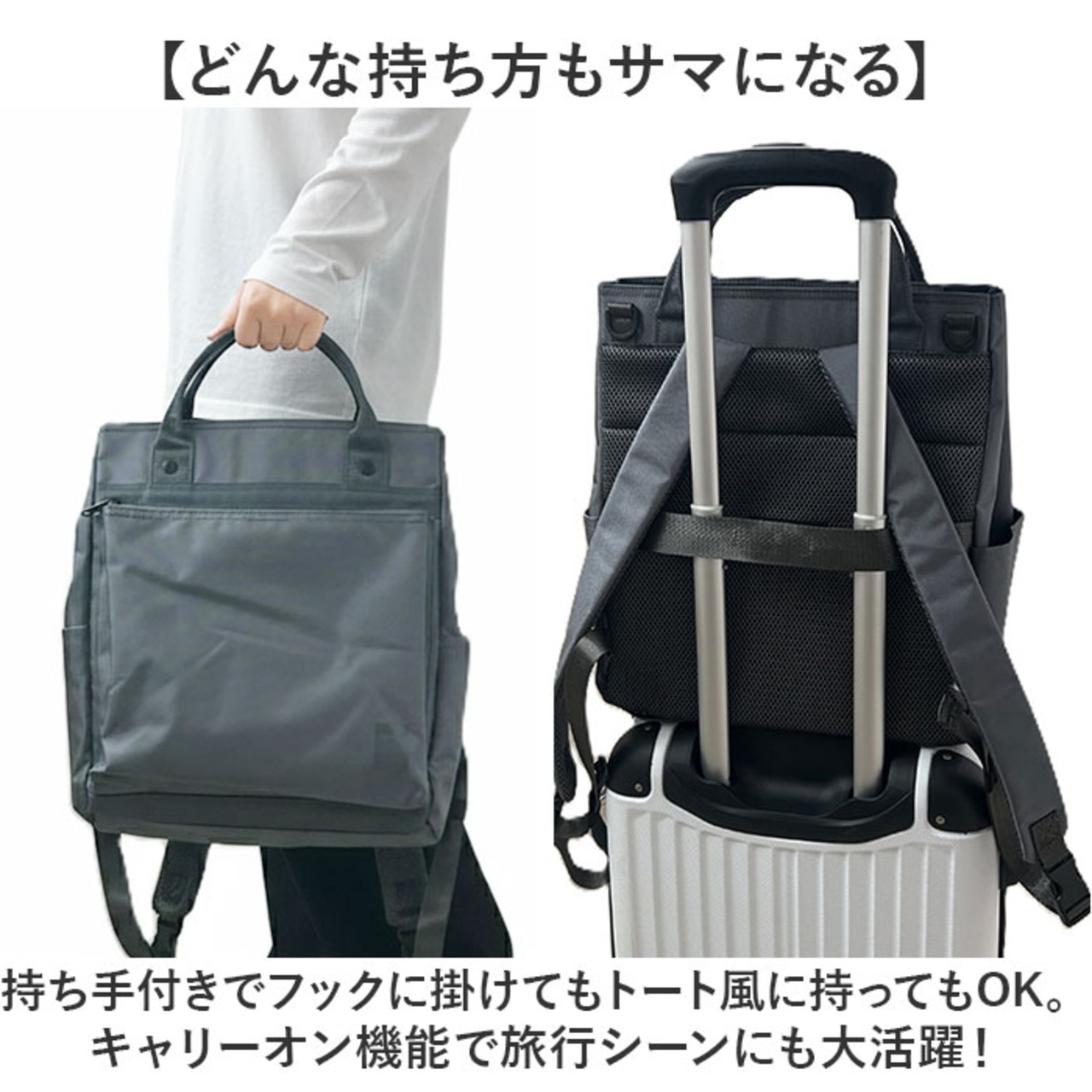 ・持ち手付きでフックに掛けてもトート風に持ってもOK。キャリーオン機能で旅行シーンにも大活躍!