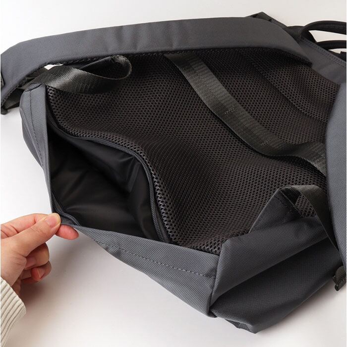 ・背面とショルダーにクッション性のあるメッシュ素材を採用。ムレにくく、長時間でも快適な背負い心地。