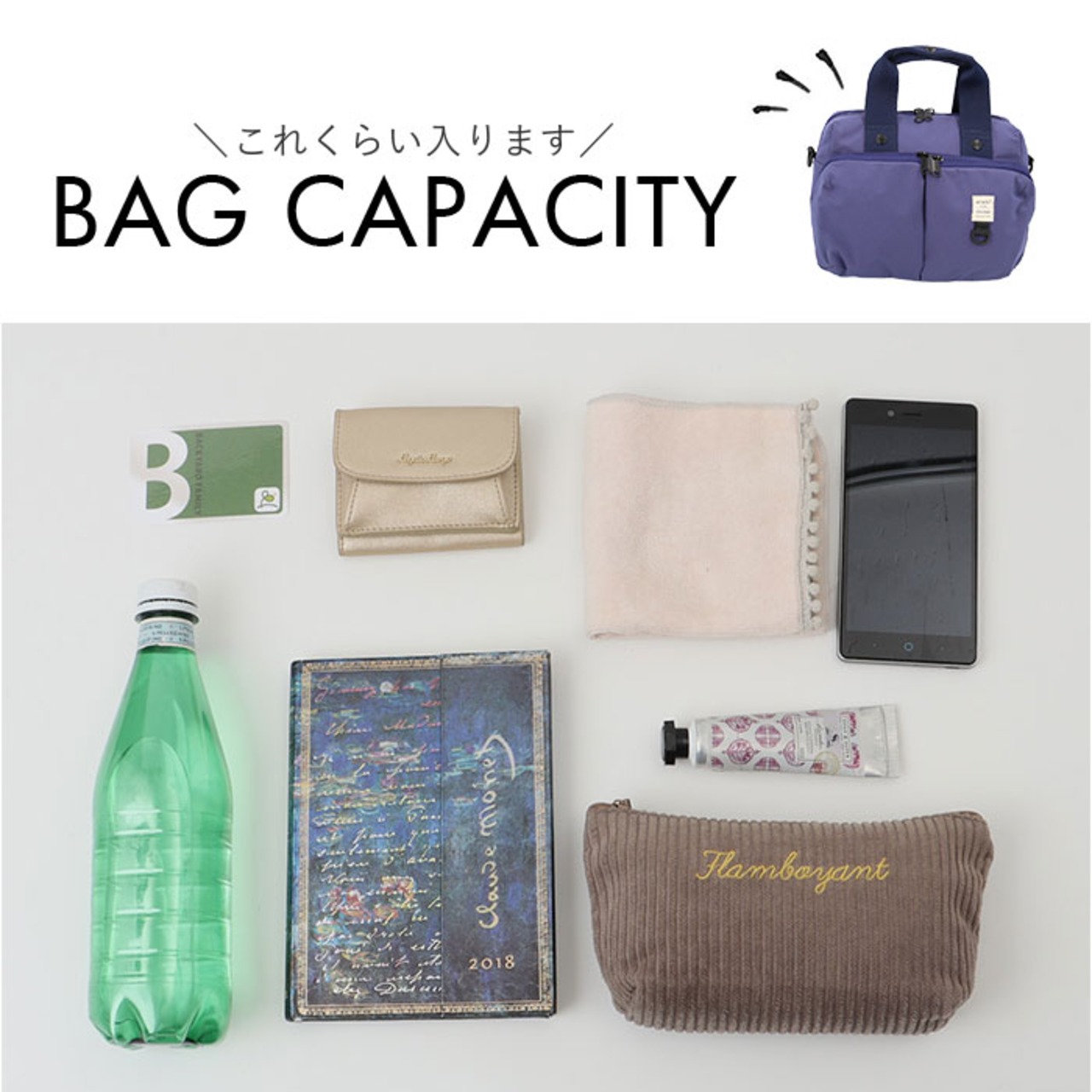 ・500mlのペットボトルや長財布がすっぽり。コンパクトに見えて、必要な物はしっかりと収納。