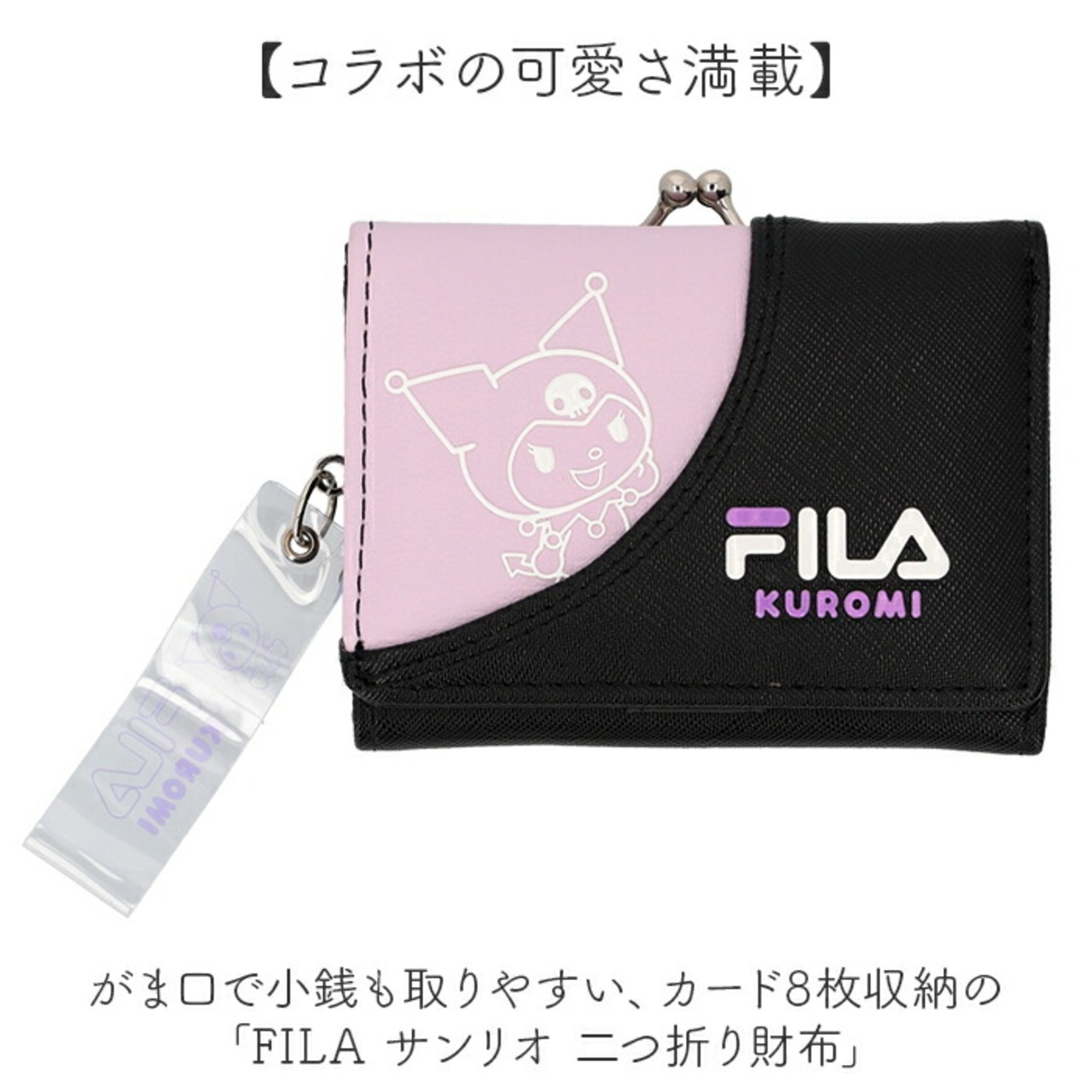 ・がま口で小銭も取りやすい、カード8枚収納の「FILA サンリオ 二つ折り財布」。