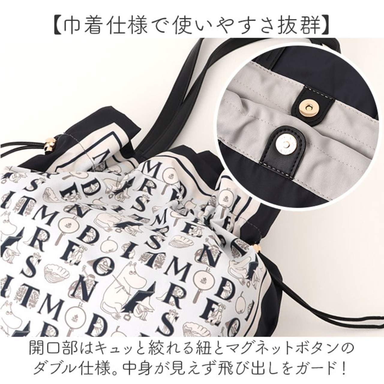 ・開口部はキュッと絞れる紐とマグネットボタンのダブル仕様。中身が見えず飛び出しをガード!