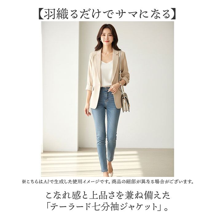 ・こなれ感と上品さを兼ね備えた「テーラード七分袖ジャケット」。