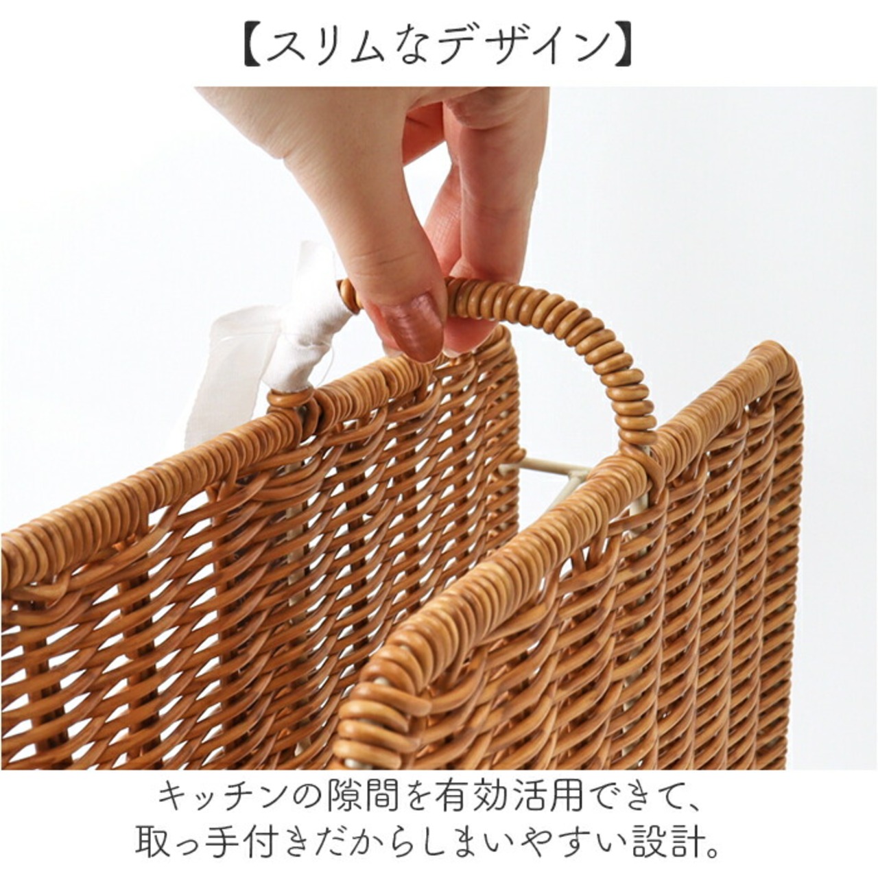・キッチンの隙間を有効活用できて、取っ手付きだからしまいやすい設計。