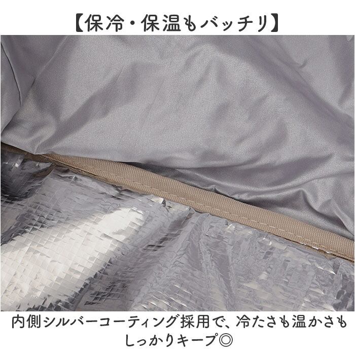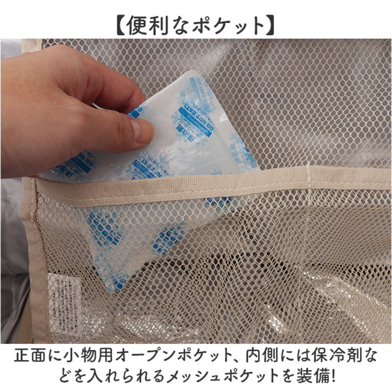 ・正面に小物用オープンポケット、内側には保冷剤などを入れられるメッシュポケットを装備!