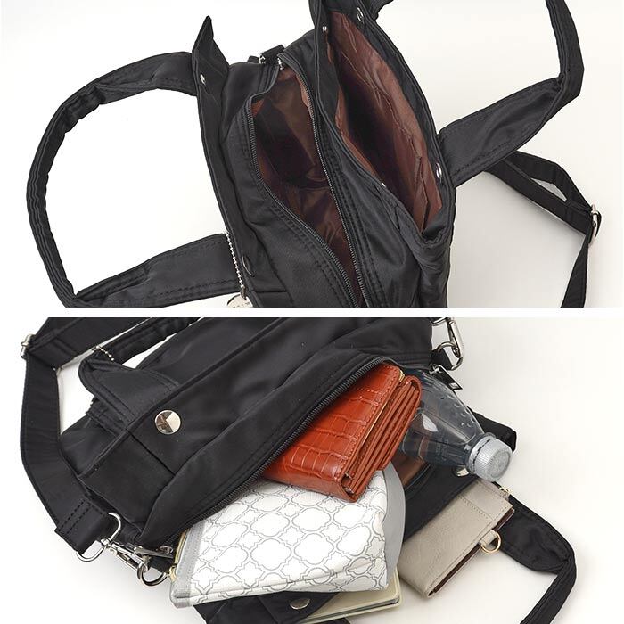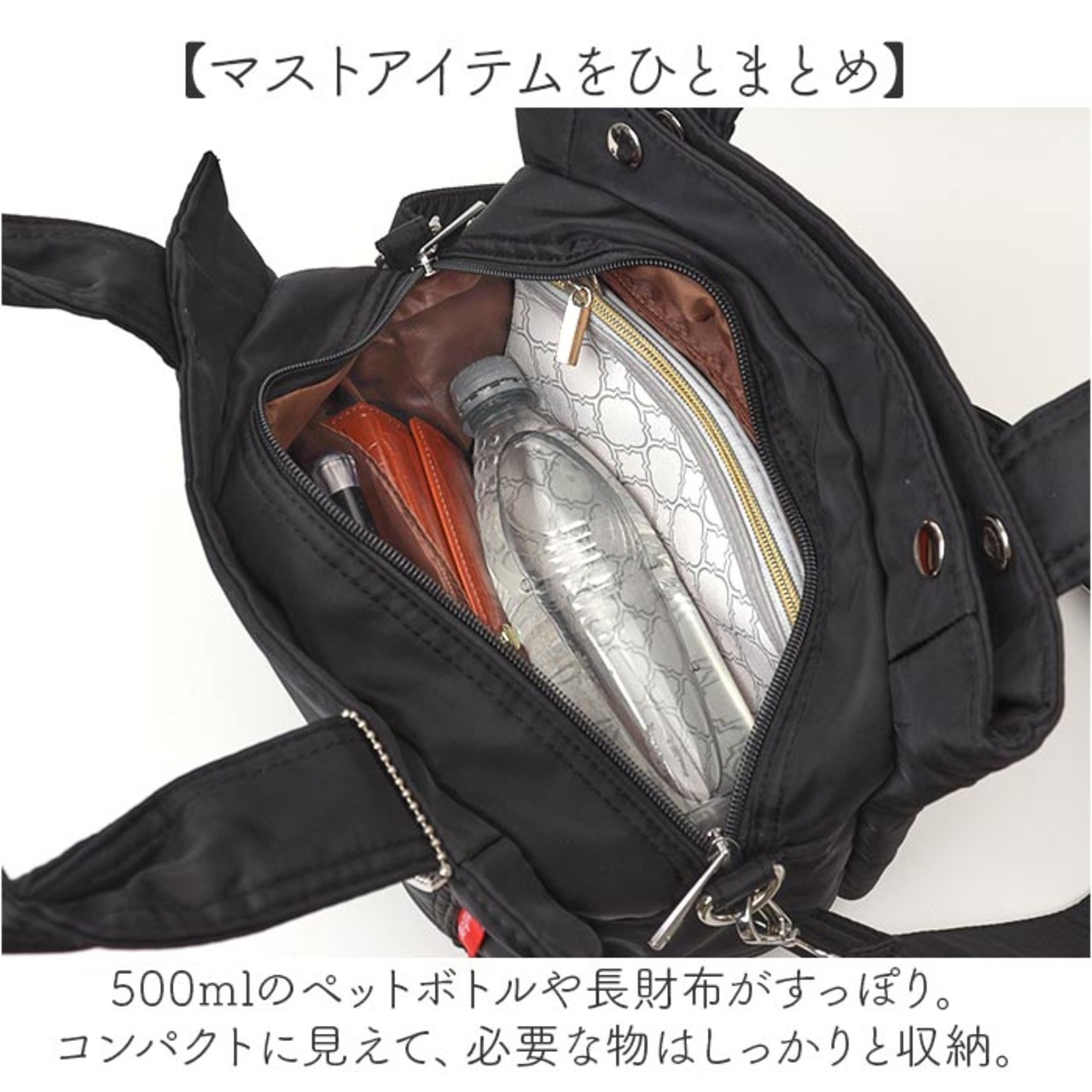 ・500mlのペットボトルや長財布がすっぽり。コンパクトに見えて、必要な物はしっかりと収納。