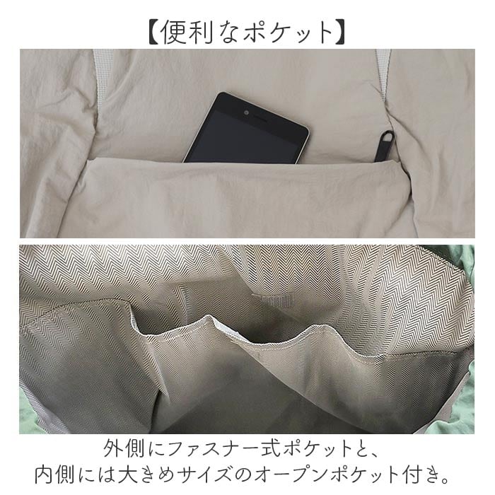 ・外側にファスナー式ポケットと、内側には大きめサイズのオープンポケット付き。