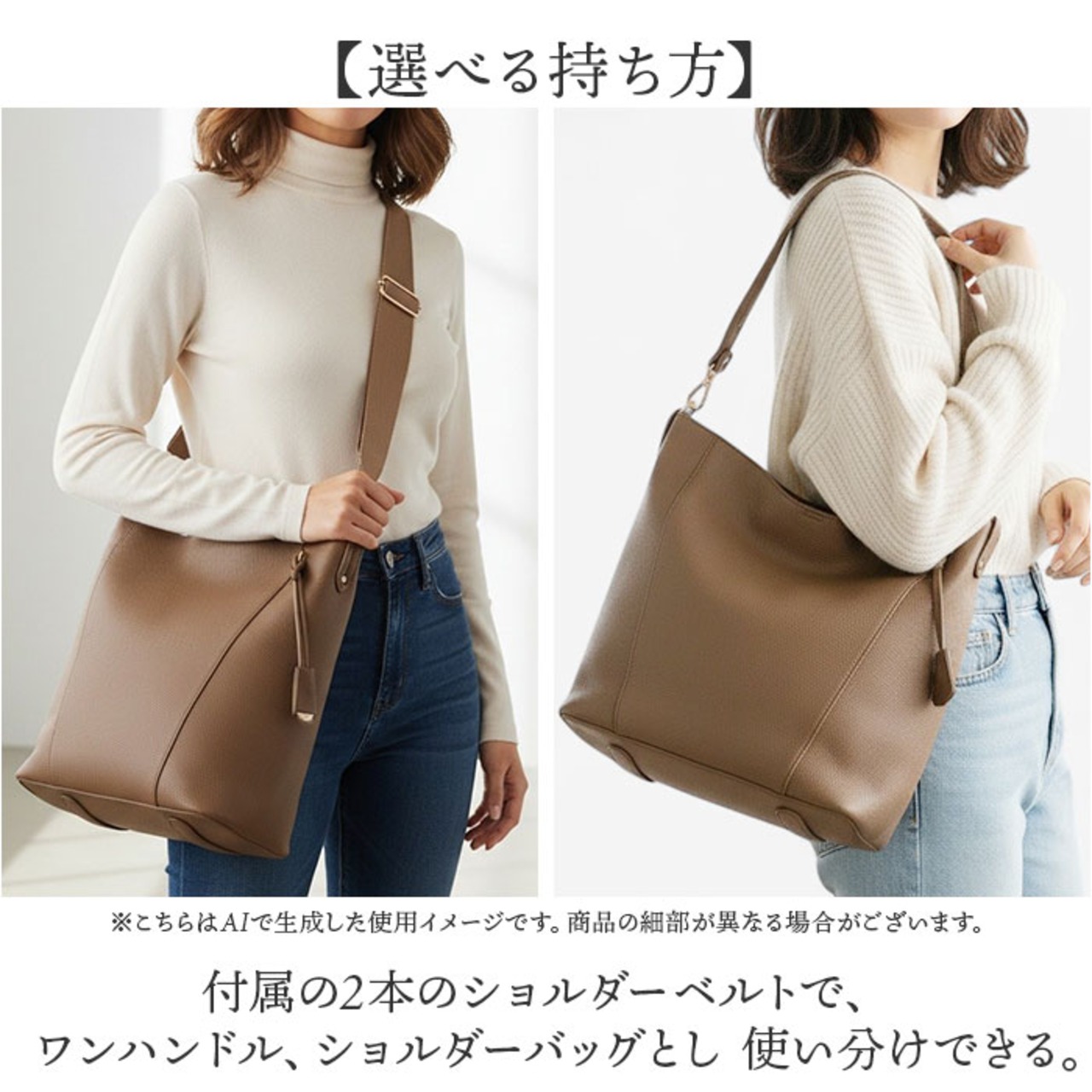 ・付属の2本のショルダーベルトで、ワンハンドル、ショルダーバッグとして使い分けできる。