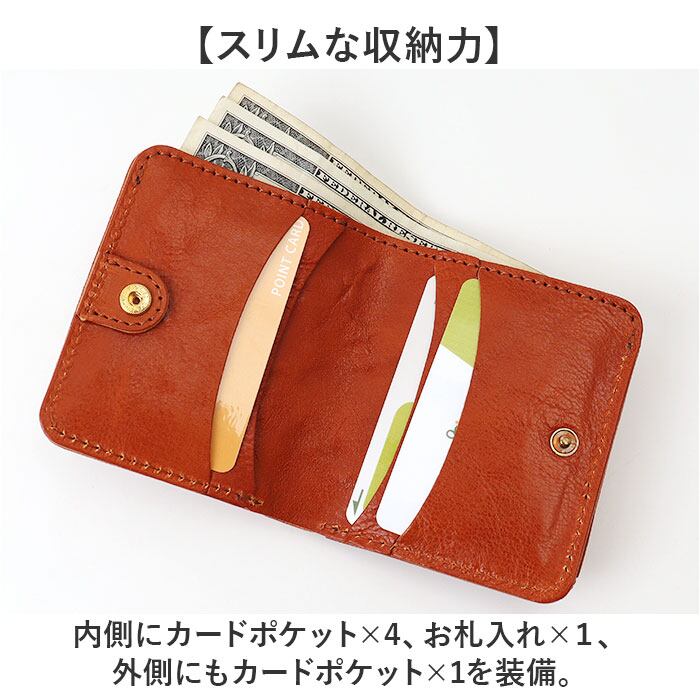 ・内側にカードポケット×4、お札入れ×1、外側にもカードポケット×1を装備。