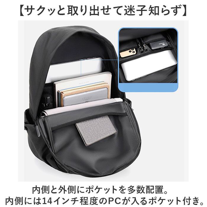 ・内側と外側にポケットを多数配置。内側には14インチ程度のPCが入るポケット付き。