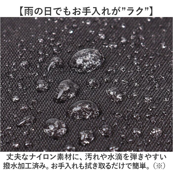 ・丈夫なナイロン素材に、汚れや水滴を弾きやすい撥水加工済み。お手入れも拭き取るだけで簡単。