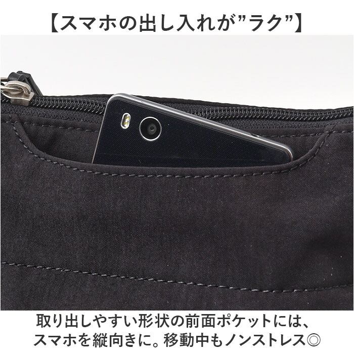 ・取り出しやすい形状の前面ポケットには、スマホを縦向きに。移動中もノンストレス◎