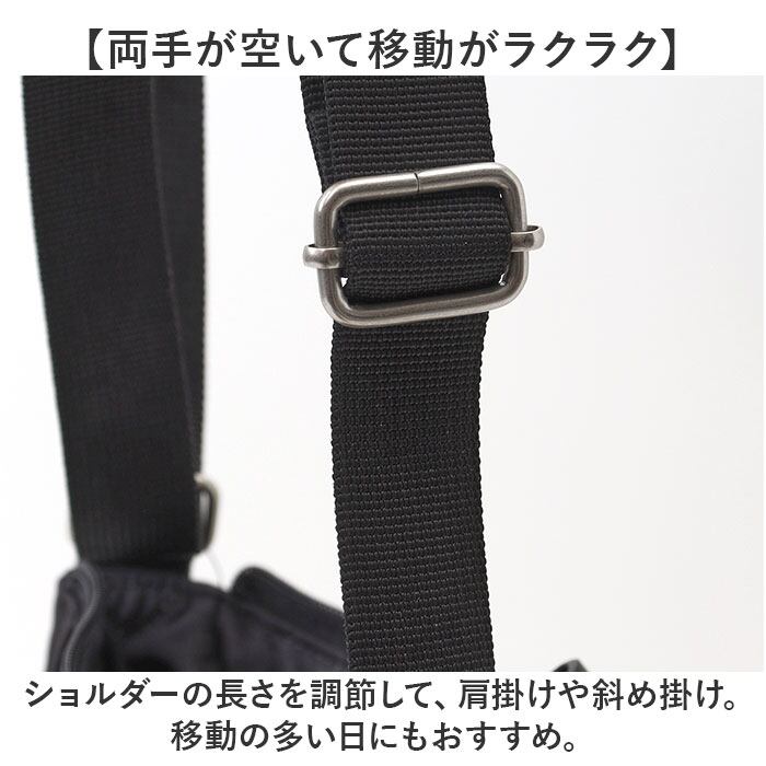 ・ショルダーの長さを調節して、肩掛けや斜め掛け。移動の多い日にもおすすめ。