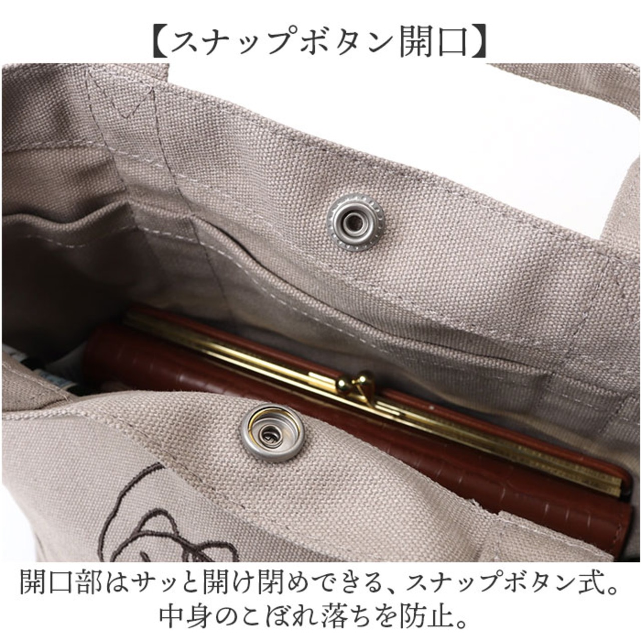 ・開口部はサッと開け閉めできる、スナップボタン式。中身のこぼれ落ちを防止。