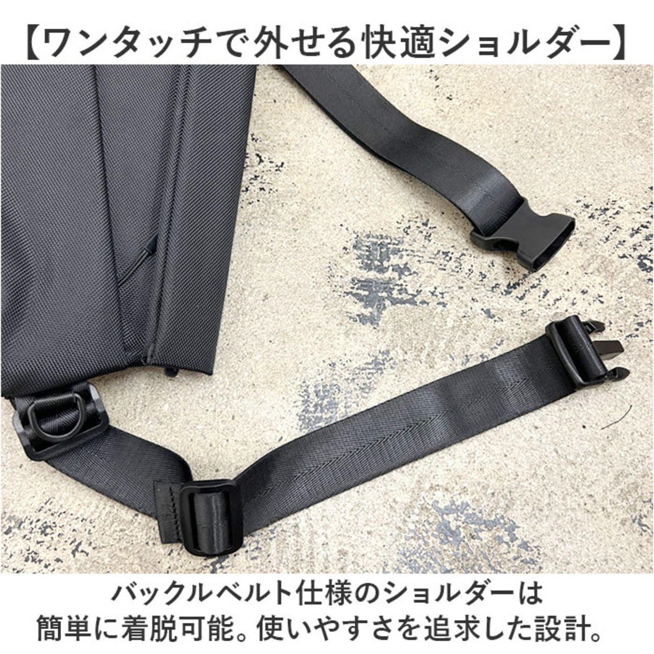 ・バックルベルト仕様のショルダーは簡単に着脱可能。使いやすさを追求した設計。