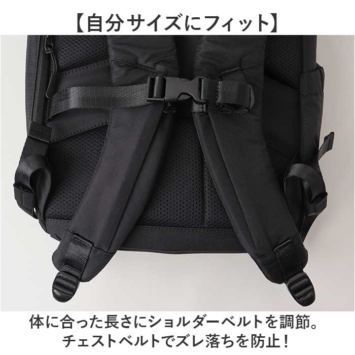 ・体に合った長さにショルダーベルトを調節。チェストベルトでズレ落ちを防止!