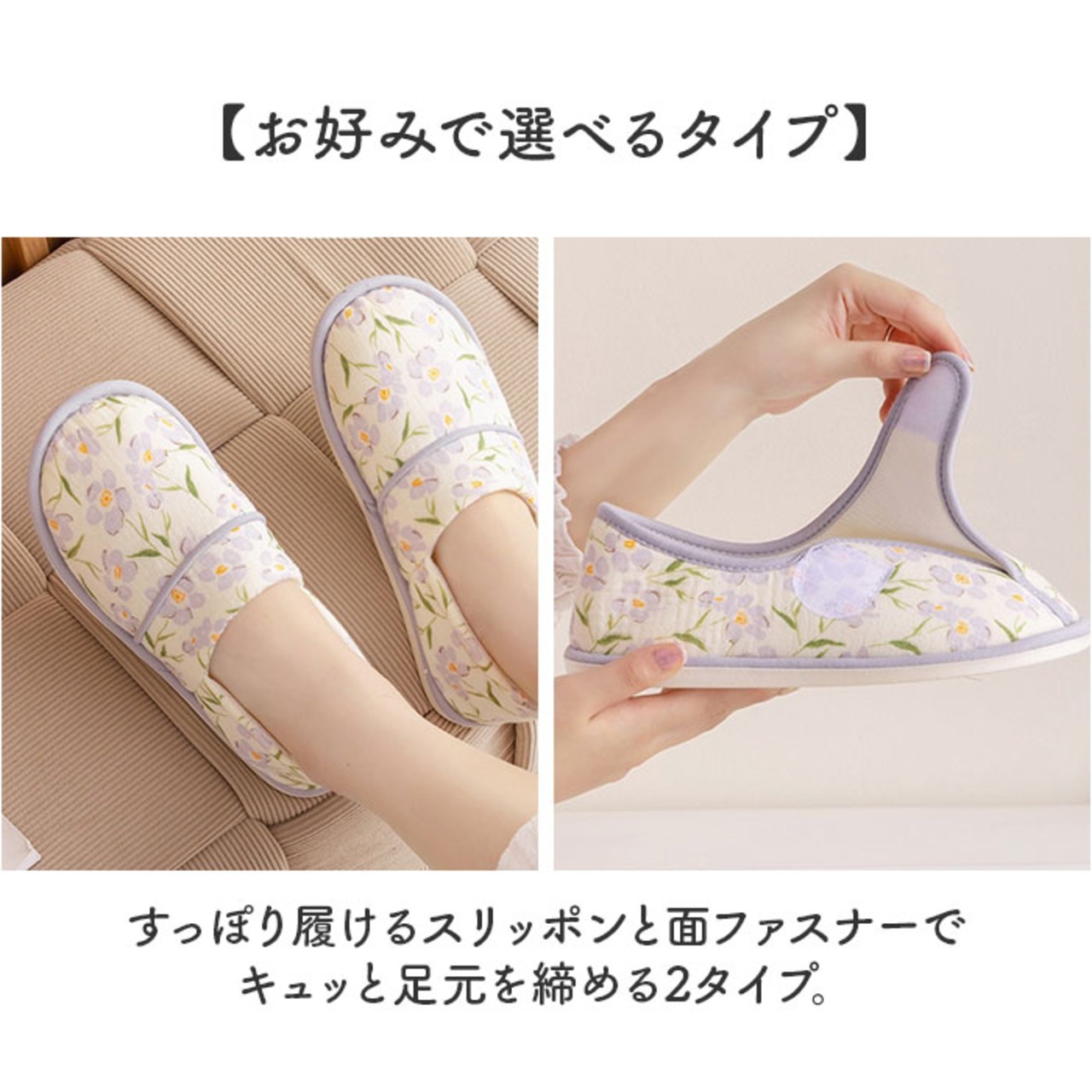 ・すっぽり履けるスリッポンと面ファスナーでキュッと足元を締める2タイプ。
