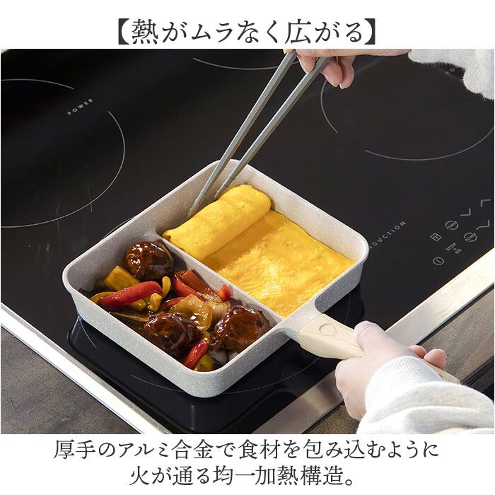 ・程よい高さのある仕切り付きで、卵焼きとおかずを一度にラクラク調理!