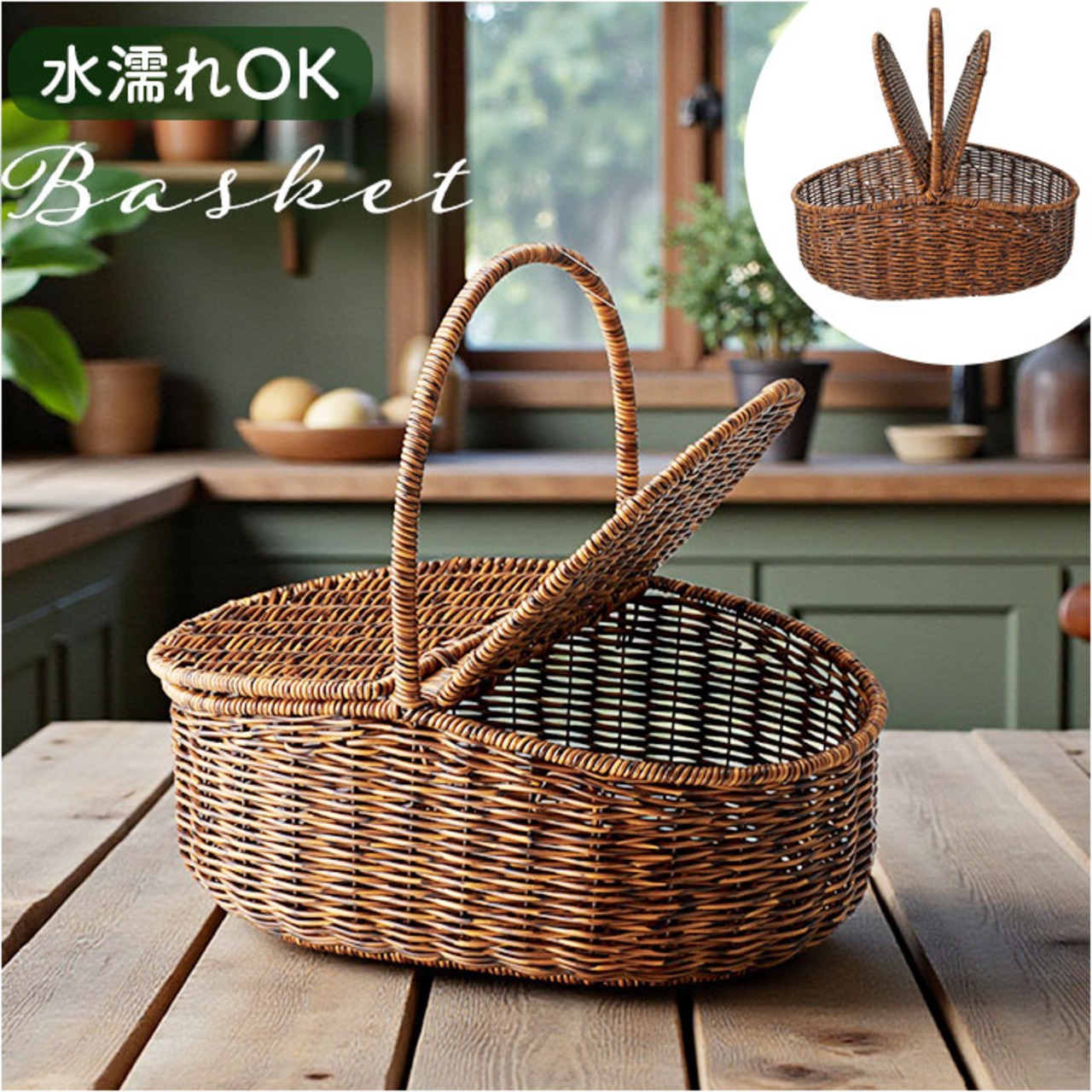 ・水に強くお手入れ簡単な持ち手付き収納かご。