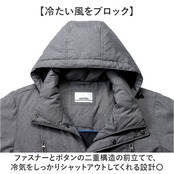 ・ファスナーとボタンの二重構造の前立てで、冷気をしっかりシャットアウトしてくれる設計〇