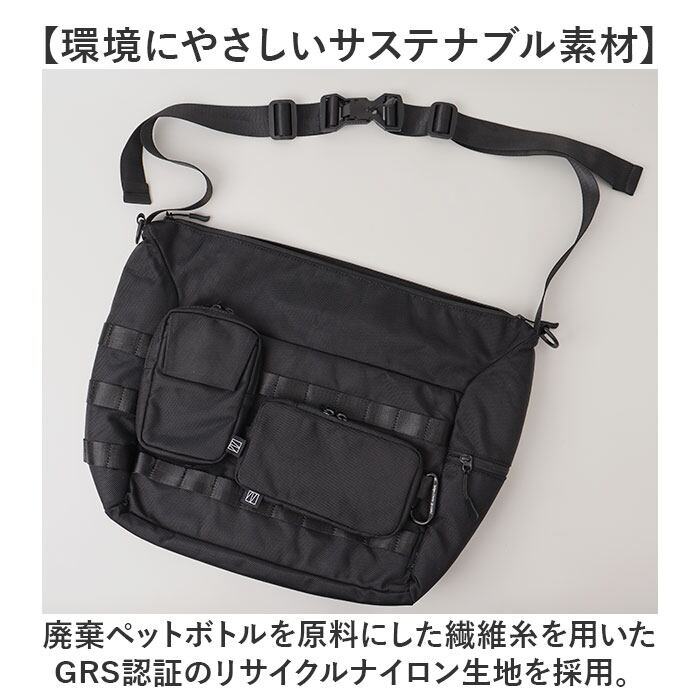 ・廃棄ペットボトルを原料にした繊維糸を用いたGRS認証のリサイクルナイロン生地を採用。