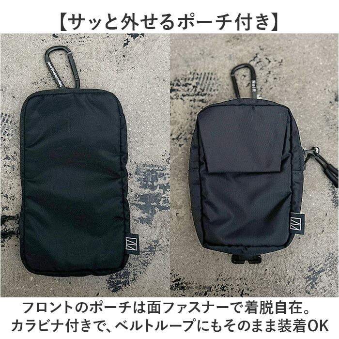 ・フロントのポーチは面ファスナーで着脱自在。カラビナ付きで、ベルトループにもそのまま装着OK