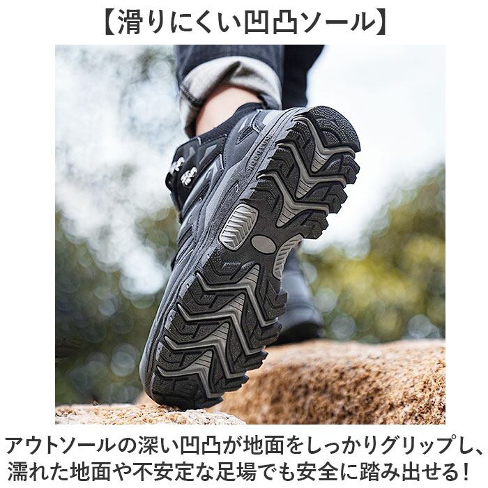 ・アウトソールの深い凹凸が地面をしっかりグリップし、濡れた地面や不安定な足場でも安全に踏み出せる!