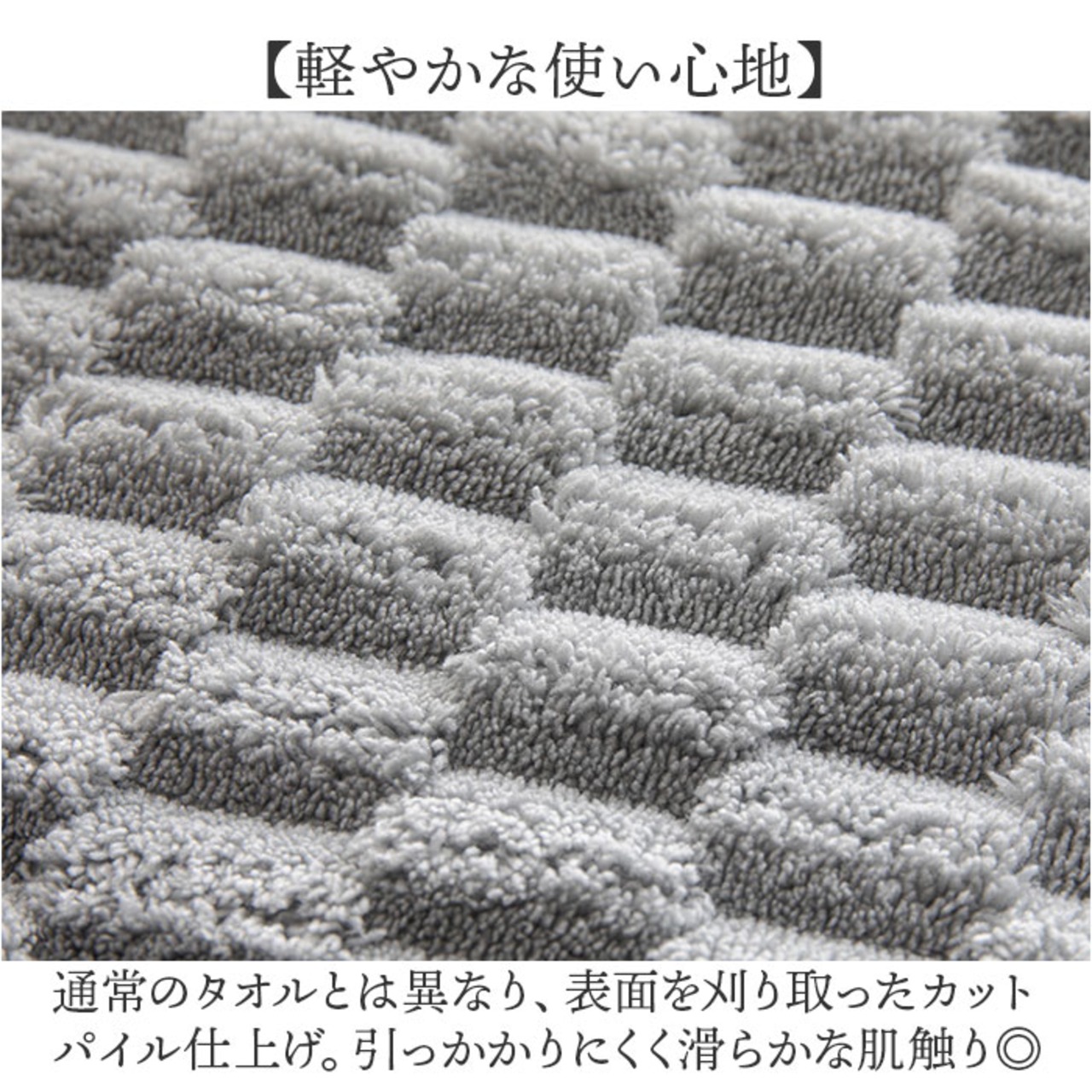 ・通常のタオルとは異なり、表面を刈り取ったカットパイル仕上げ。引っかかりにくく滑らかな肌触り◎