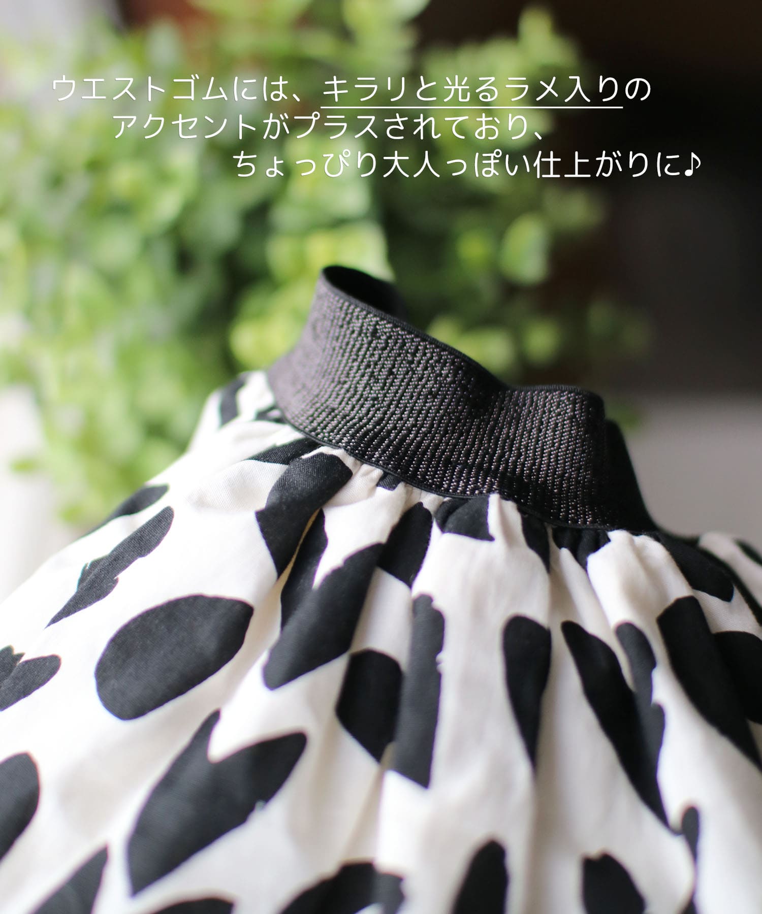 ・ウエストゴムには、キラリと光るラメ入りのアクセントがプラスされており、ちょっぴり大人っぽい仕上がりに。