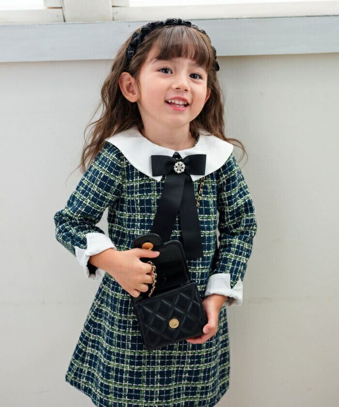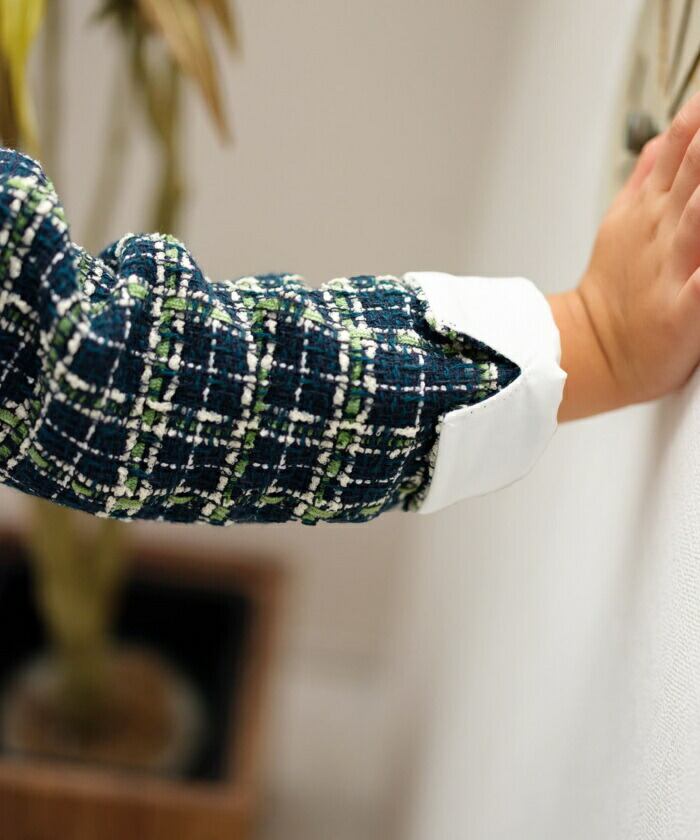 ・深みのあるグリーンのツイード生地が落ち着いた印象を与えつつも、華やかなアクセントに。