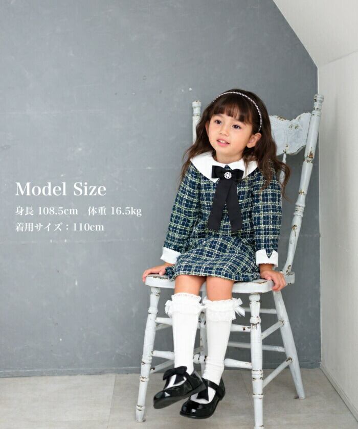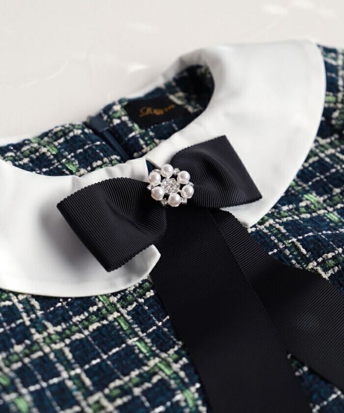 ・シンプルながらも、黒のリボンとパールのブローチが首元にきちんとした印象を与え、可愛さと大人っぽさを兼ね備えています。