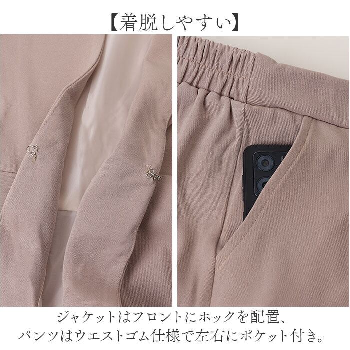 ・ジャケットはフロントにホックを配置、パンツはウエストゴム仕様で左右にポケット付き。