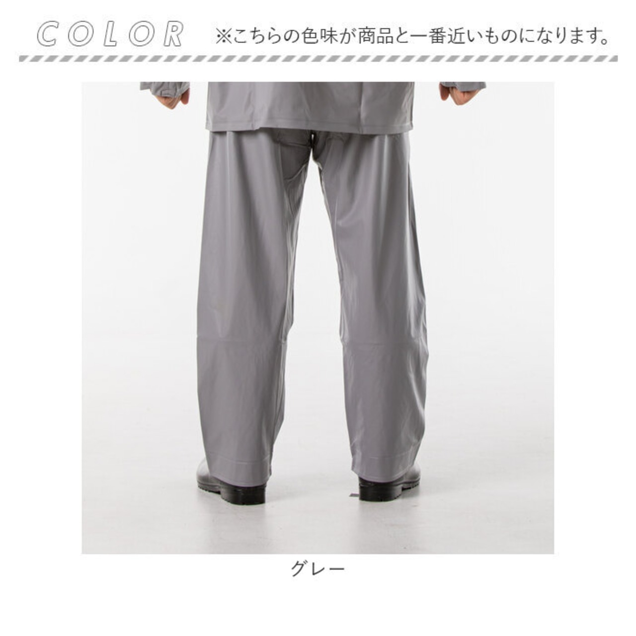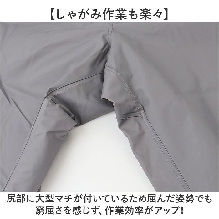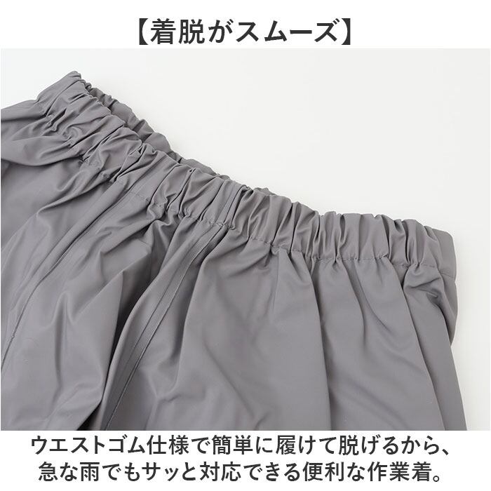 ・ウエストゴム仕様で簡単に履けて脱げるから、急な雨でもサッと対応できる便利な作業着。