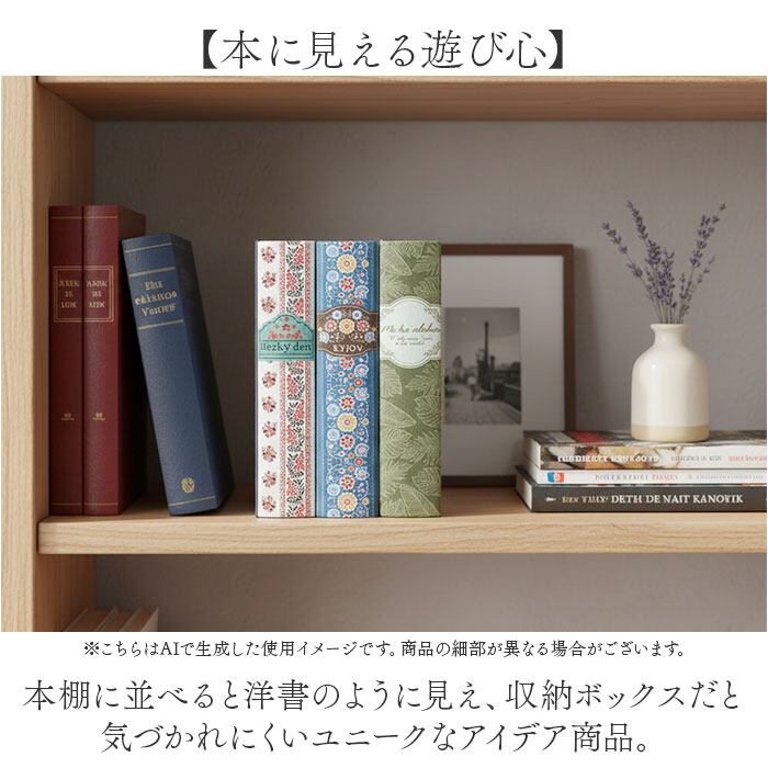 ・本棚に並べると洋書のように見え、収納ボックスだと気づかれにくいユニークなアイデア商品。
