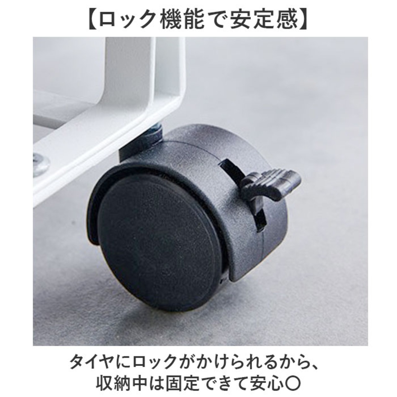 ・タイヤにロックがかけられるから、収納中は固定できて安心〇