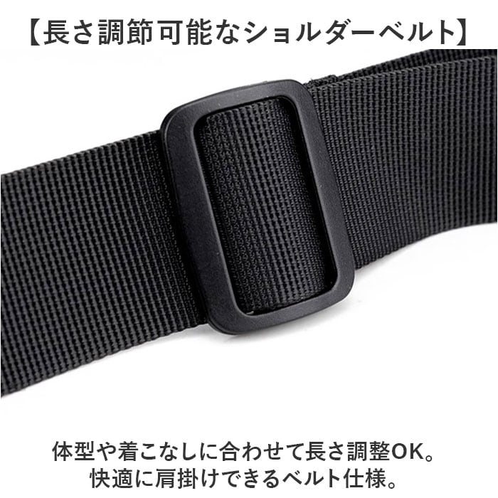 ・体型や着こなしに合わせて長さ調整OK。快適に肩掛けできるベルト仕様。